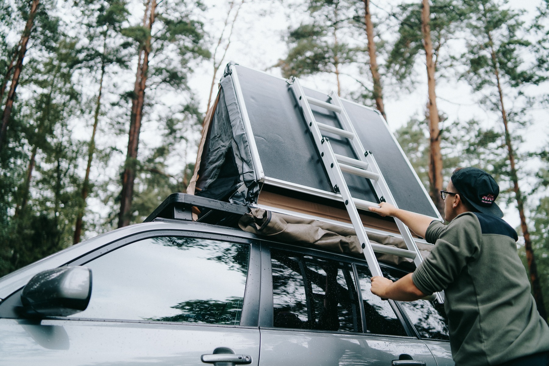 Undoubtedly, this roof-top tent’s most remarkable feature is its unparalleled panoramic view. It has windows on all four sides, each equipped with adjustable skylights. Therefore, we can open or close them to enjoy fresh air, bask in sunlight, or marvel at the sky. Each window and door also includes reliable locks, enabling us to adjust the opening for privacy or weather conditions. Inside, we find two spacious hanging pockets measuring 34 cm x 22 cm, ideal for storing tablets, books, and phones. Additionally, the entrance area provides extra storage for larger items. So, how exactly do we enter this splendid abode? An extendable, sturdy aluminum ladder ensures easy and safe access, further enhancing the tent’s functionality.